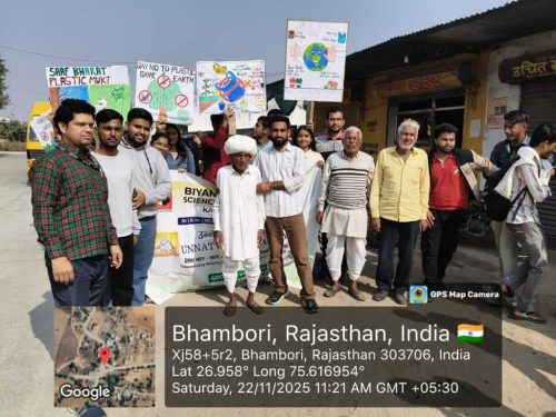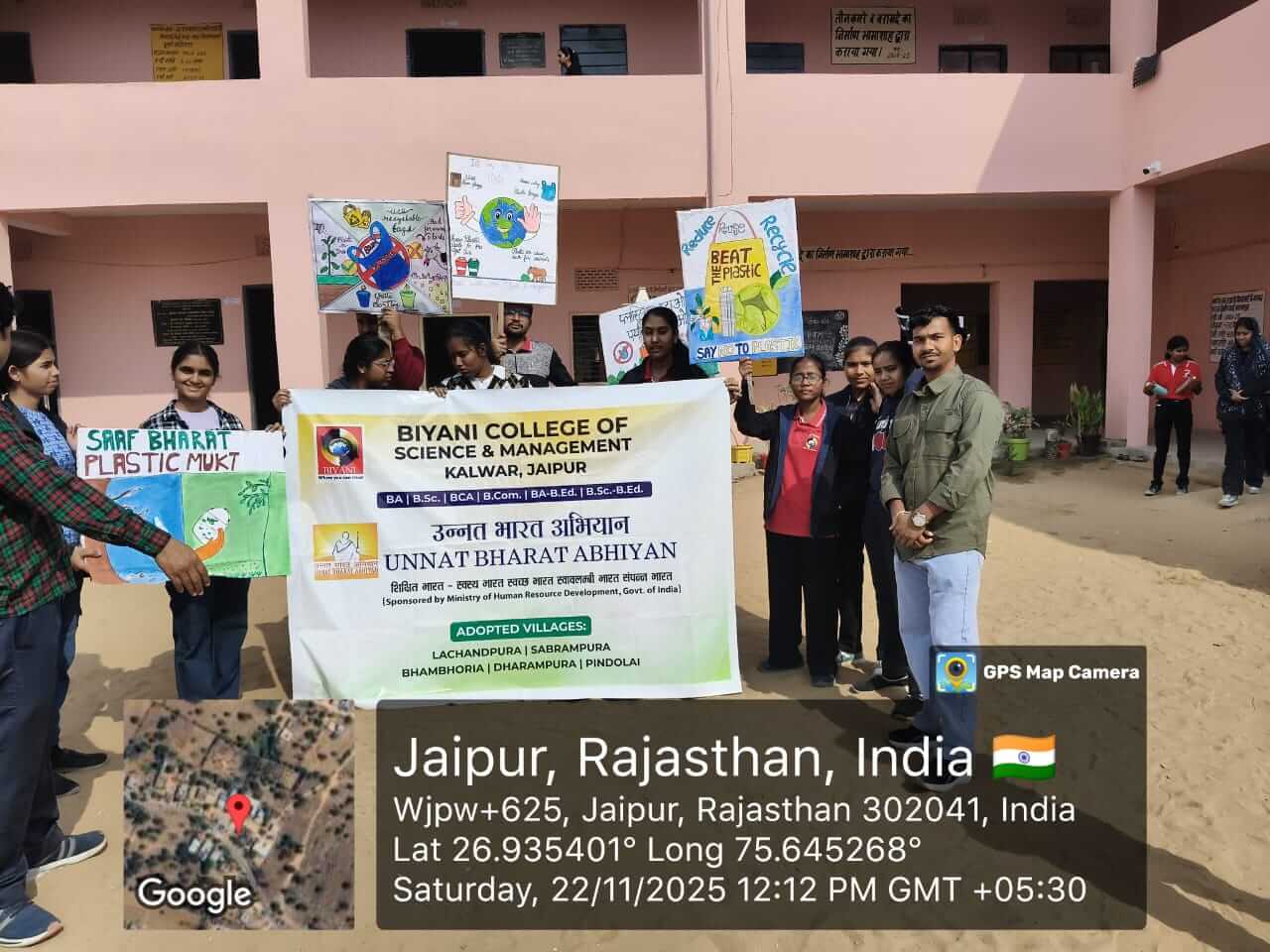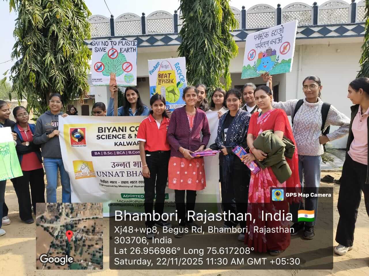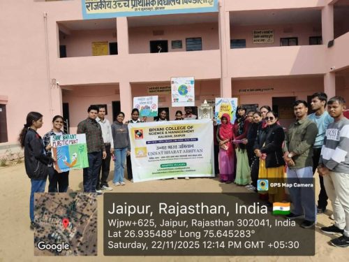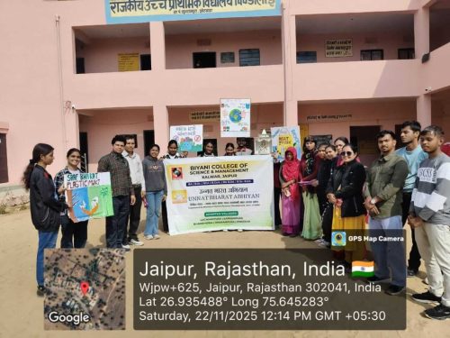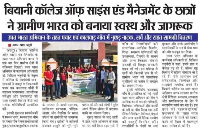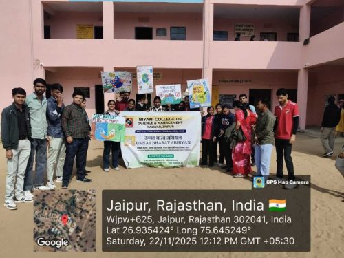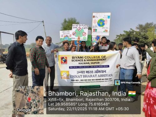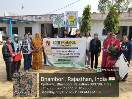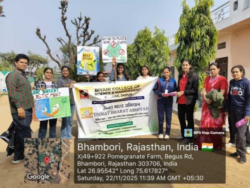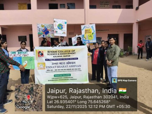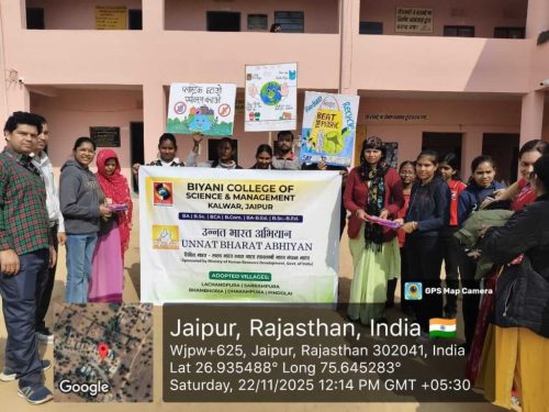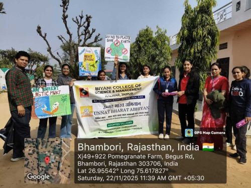 Under the Unnat Bharat Abhiyan initiative, the students of Biyani Group of Colleges conducted a village visit focused on creating awareness about beating plastic pollution and promoting menstrual hygiene. During the visit, the team interacted with villagers, encouraged the reduction of single-use plastic, and explained its harmful effects on the environment. Sanitary pads were also distributed to women and girls to support health and hygiene practices. The visit ended positively, spreading awareness and inspiring the community toward a cleaner and healthier lifestyle.