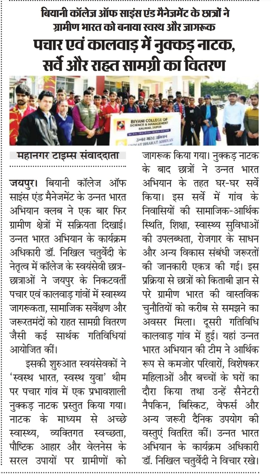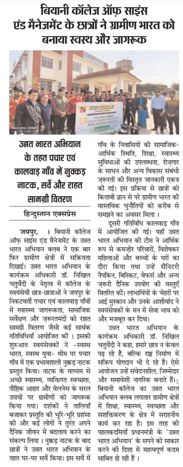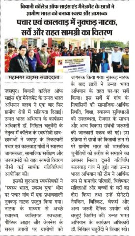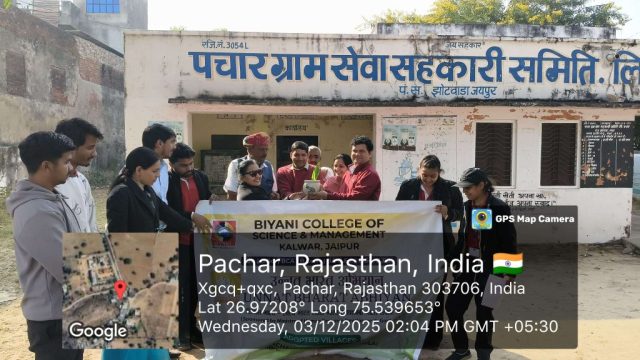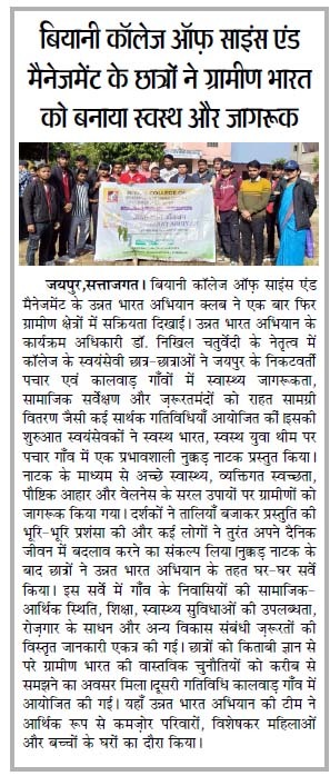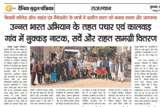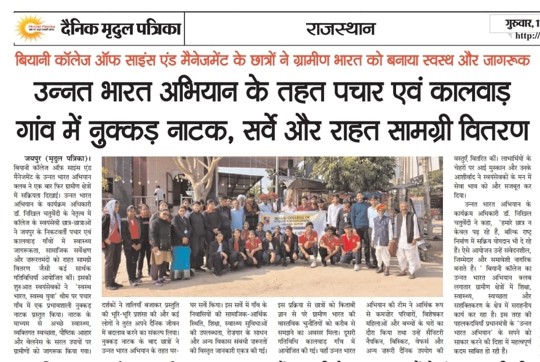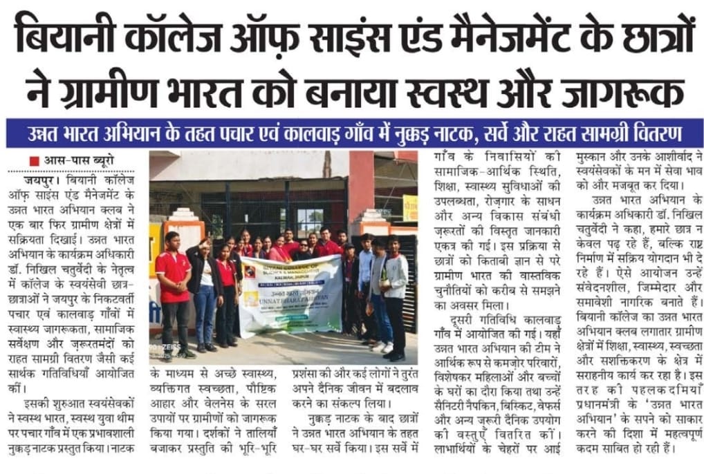 Biyani College of Science and Management began on 3 December 2025 with the regular prayer assembly, followed by the energetic UBA clab. After the auditorium session, the UBA team proceeded to Pachar village (Pachar). The day’s major activity was a Nukkad Natak presented by the volunteers on the theme “Healthy India, Healthy Youth”, spreading awareness about good health, hygiene, and wellness practices among villagers. The performance was received positively and attracted the attention of the local community.