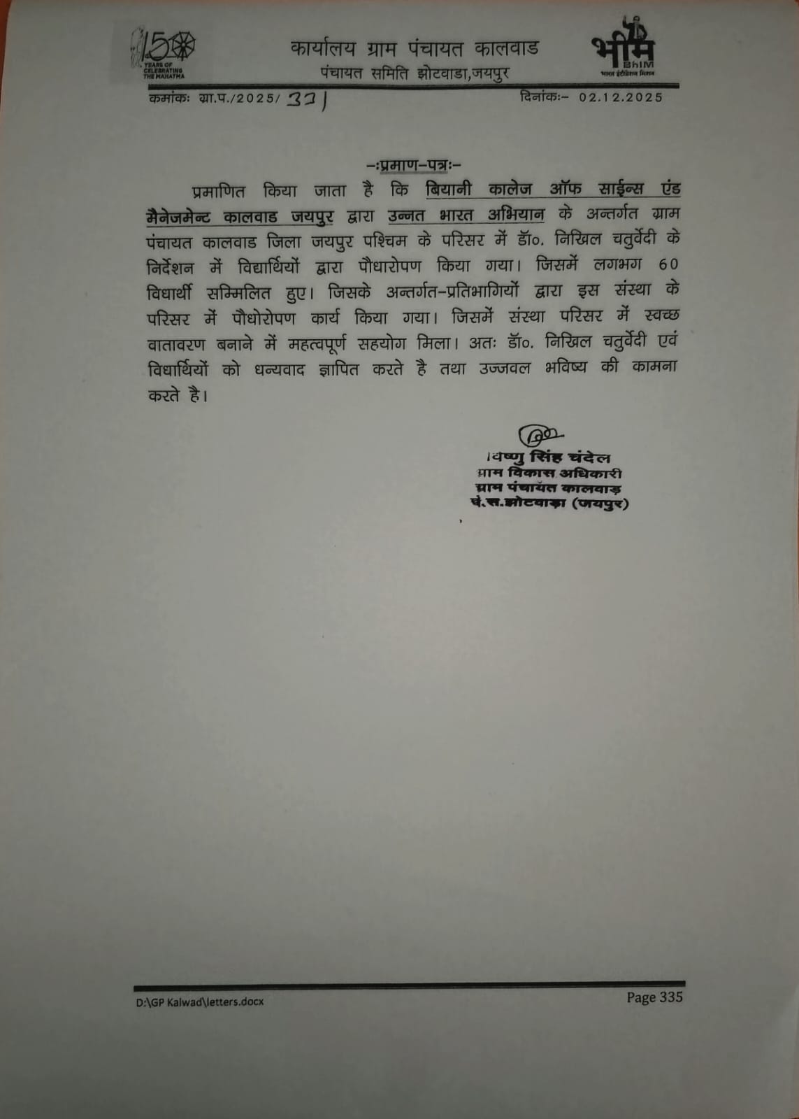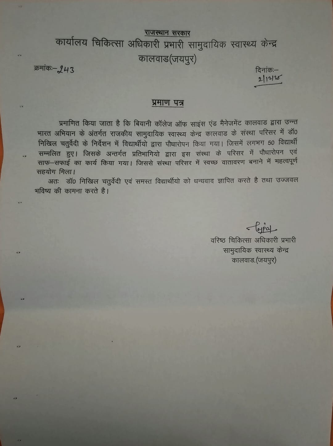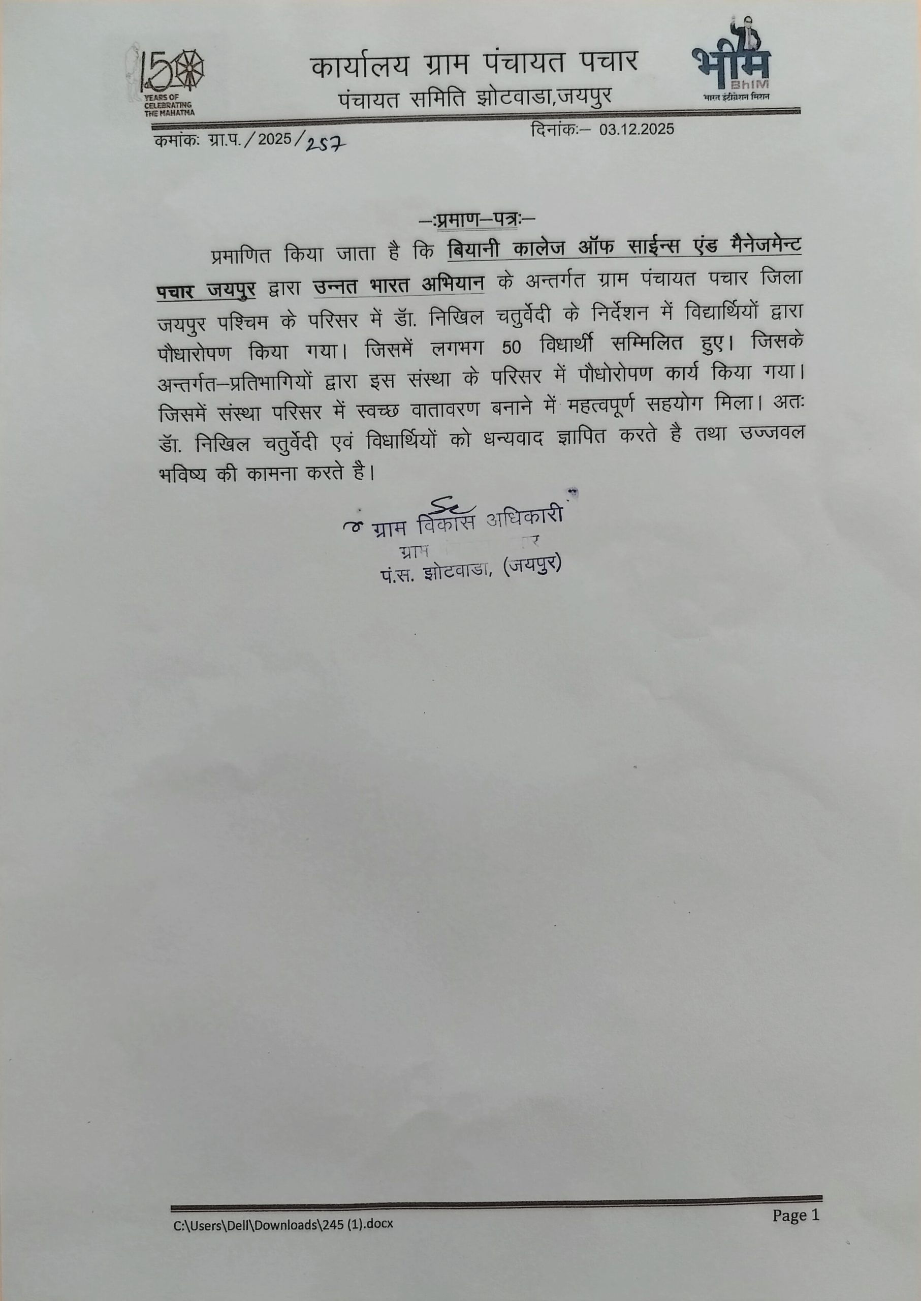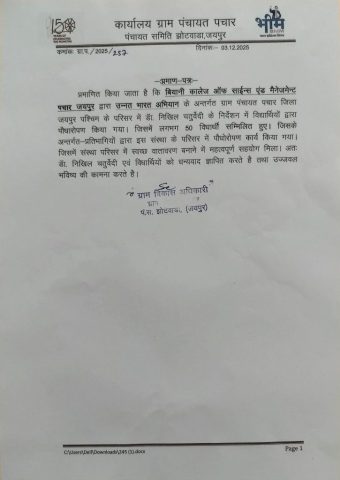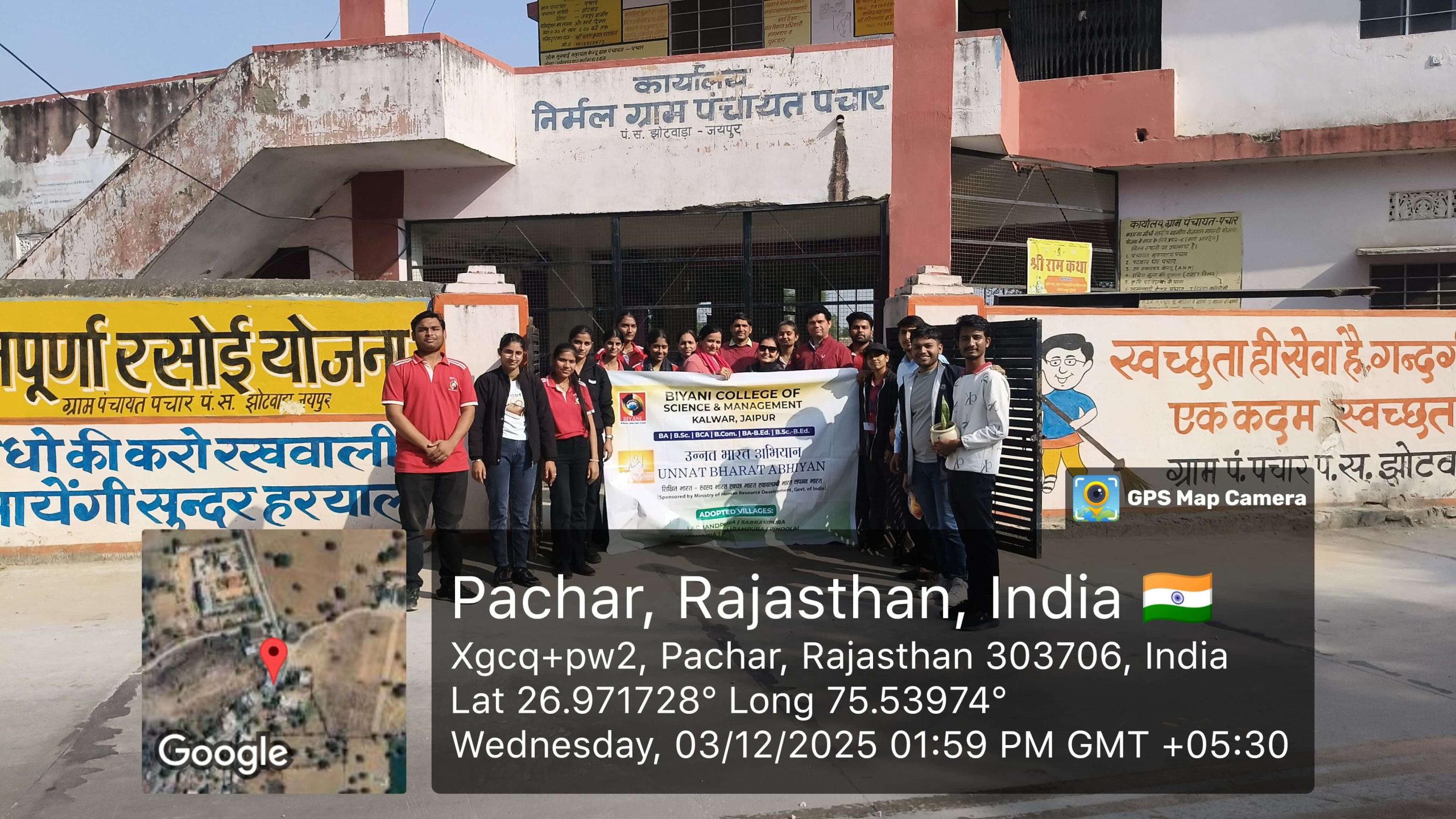 Biyani College of Science and Management began on 3 December 2025 with the regular prayer assembly, followed by the energetic UBA clab. After the auditorium session, the UBA team proceeded to Pachar village (Pachar). The day’s major activity was a Nukkad Natak presented by the volunteers on the theme “Healthy India, Healthy Youth”, spreading awareness about good health, hygiene, and wellness practices among villagers. The performance was received positively and attracted the attention of the local community.